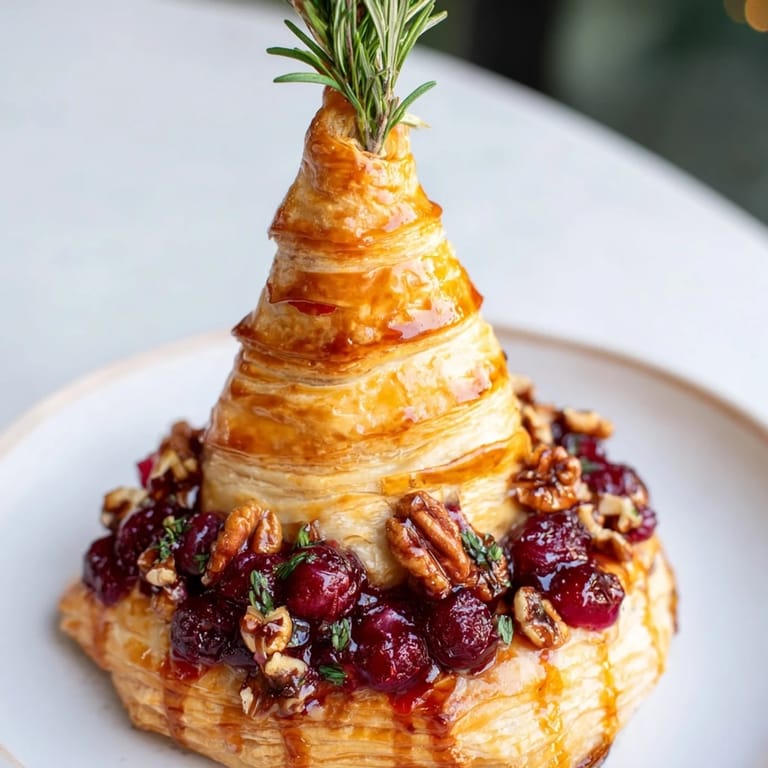 Save Pin A festive, elegantly wrapped brie cheese, baked in golden puff pastry shaped like a pine tree, filled with cranberry sauce and toasted pecans—perfect for holiday gatherings.
