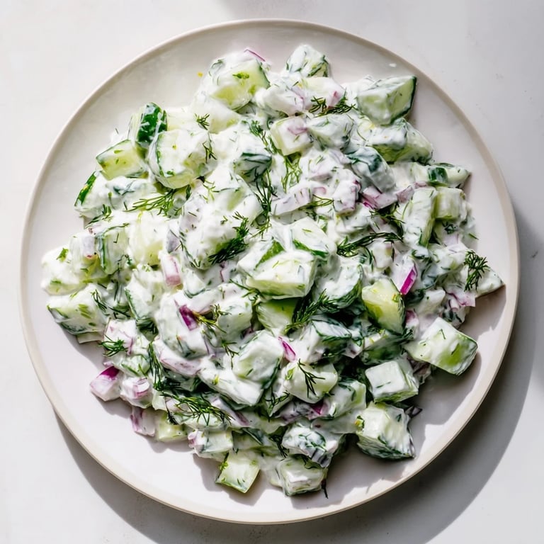 This salad highlights diced cucumbers and creamy Greek yogurt blended with fresh dill, garlic, and lemon juice for brightness. The cucumbers are drained beforehand to keep the mix crisp and fresh. Combined with olive oil and a touch of salt and pepper, it creates a cool, refreshing dish perfect for a light meal or side. Chilling enhances the flavors, making it ideal for warm days or Mediterranean-inspired menus. Optional mint adds a fresh herbal note, while extra garnishes bring added vibrancy and texture.