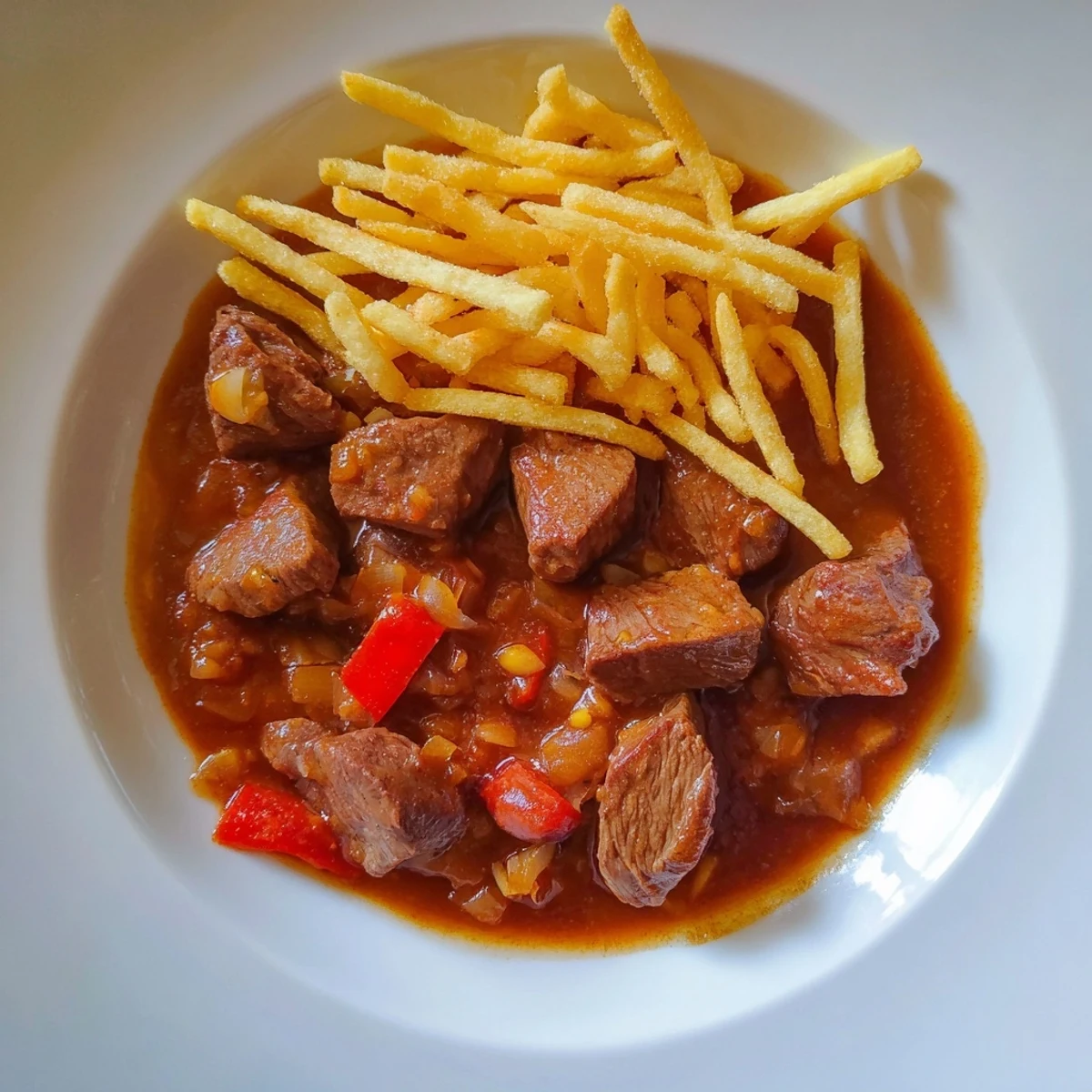 The potato strips are not a side dish; they're the textural anchor that keeps this from feeling heavy or one-note. Hot, crispy, and salty, they sit on top of the goulash like a crown, shattering between your teeth while the warm sauce softens them slightly. Frying in batches is not laziness; it's respect for the oil temperature, which stays steady and produces better results. Crowd the pan and the oil temperature drops, steaming potatoes instead of frying them. Respect the process, and the process respects you back.