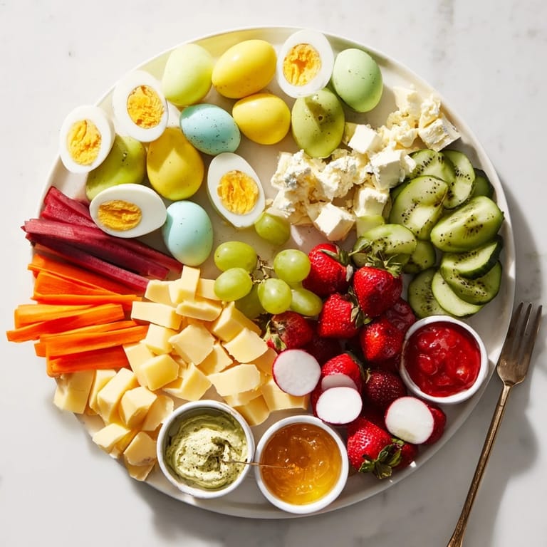 Save Pin A vibrant and festive brunch platter featuring an array of spring-inspired bites, colorful eggs, fresh fruits, and artisan breads & perfect for sharing with family and friends.