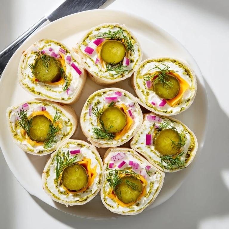 Save Pin A fun, tangy snack featuring crisp pickles and creamy cheese, all wrapped in a soft tortilla (perfect for parties, picnics, or a quick bite)