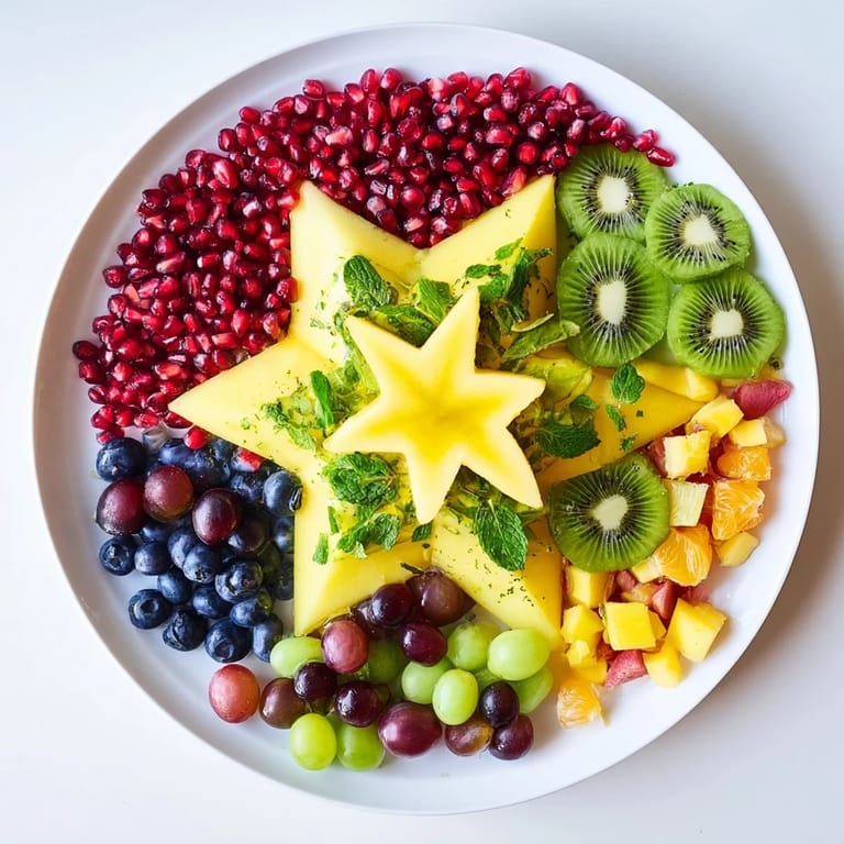 Save Pin A vibrant, refreshing fruit platter featuring juicy pomegranate seeds and fresh mint artfully arranged in a star pattern perfect for elegant brunches holiday tables or healthy snacking.