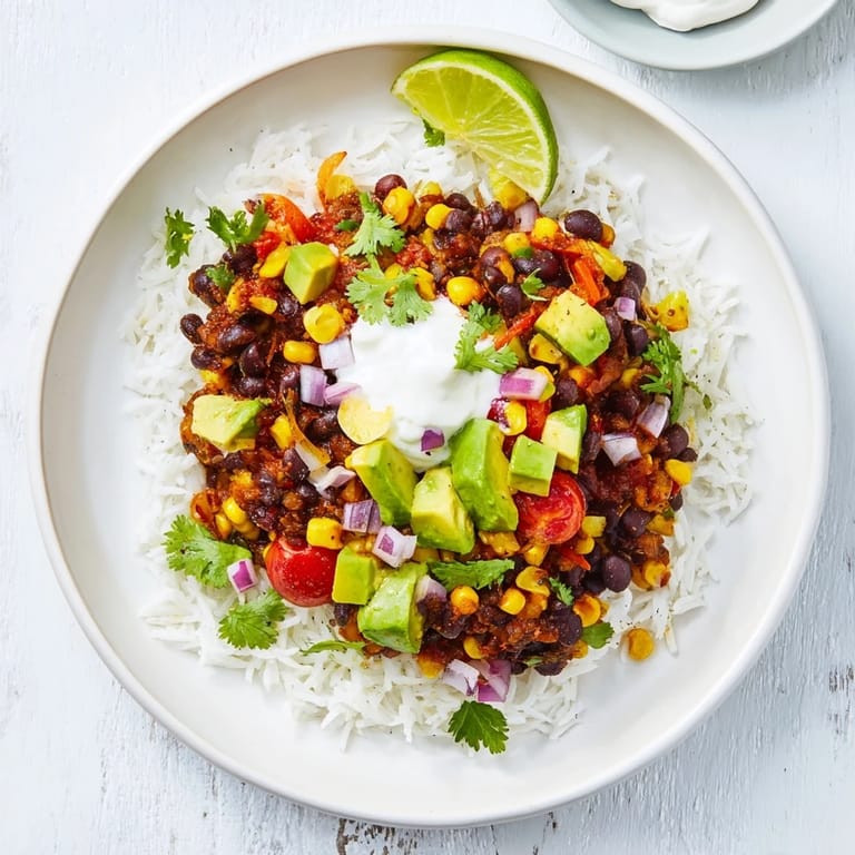 Save Pin A vibrant, satisfying bowl featuring fluffy rice, hearty beans, sweet corn, and classic Tex-Mex toppings. Perfect for a quick, flavorful meal that brings color and taste to your table.