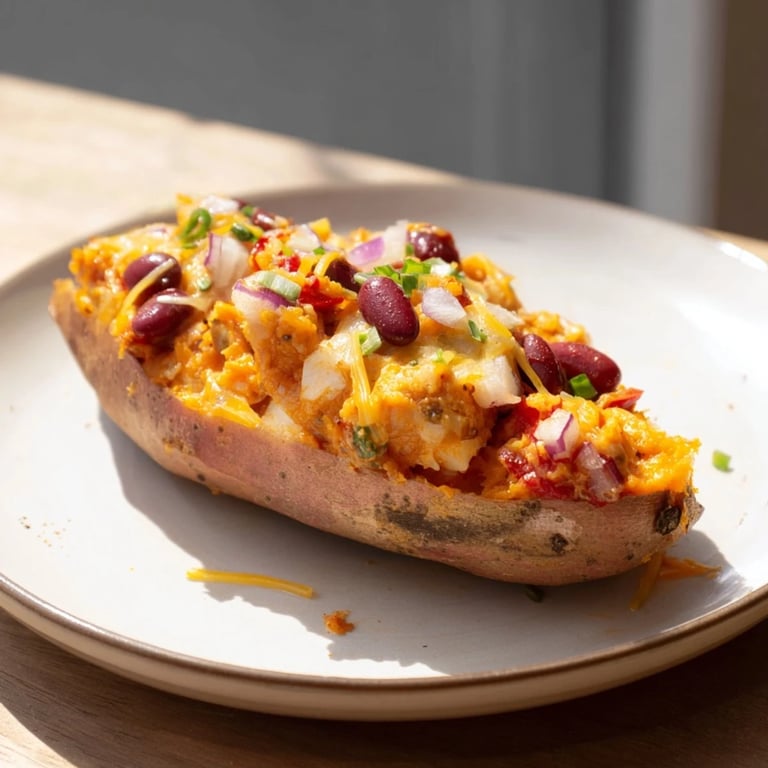A hearty, comforting dish featuring tender baked sweet potatoes filled with zesty, flavorful chili. Perfect for a wholesome weeknight meal or casual entertaining.