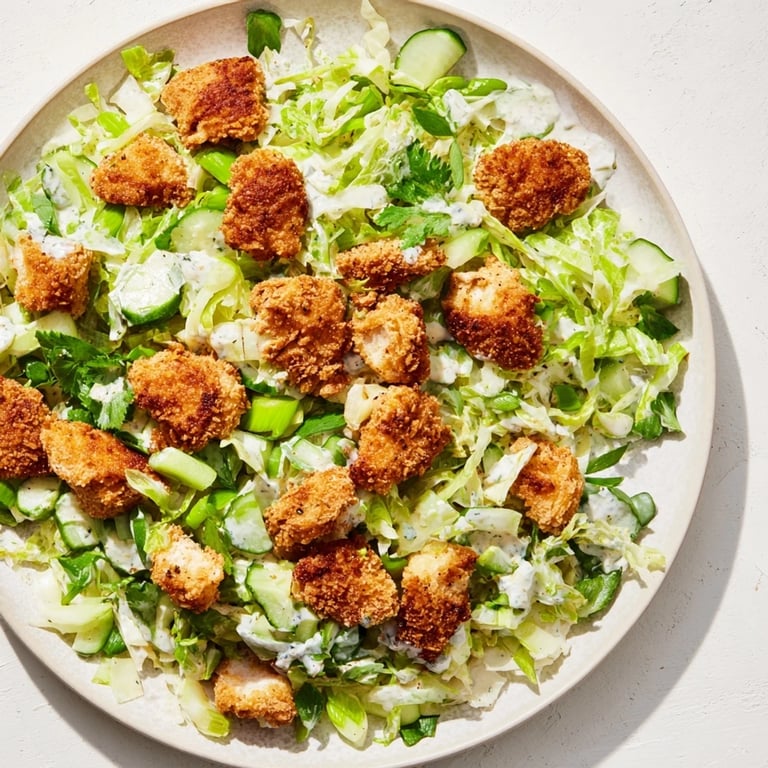Save Pin I stumbled across this salad on a Tuesday when I had leftover nuggets from my niece's lunch and a fridge drawer full of greens I'd been ignoring. Tossing them together felt almost too easy, but when I drizzled that herb-packed dressing over everything, the whole bowl transformed. The crunch of cabbage against warm, crispy nuggets was unexpectedly perfect. My husband walked in, skeptical, then went back for seconds without a word. Sometimes the best recipes happen when you stop overthinking.