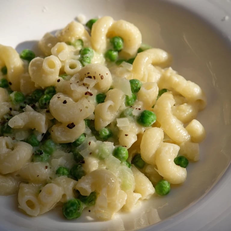 Save Pin A comforting, budget-friendly pasta dish that combines tender macaroni with sweet green peas in a light, flavorful sauce. Perfect for a quick weeknight meal.