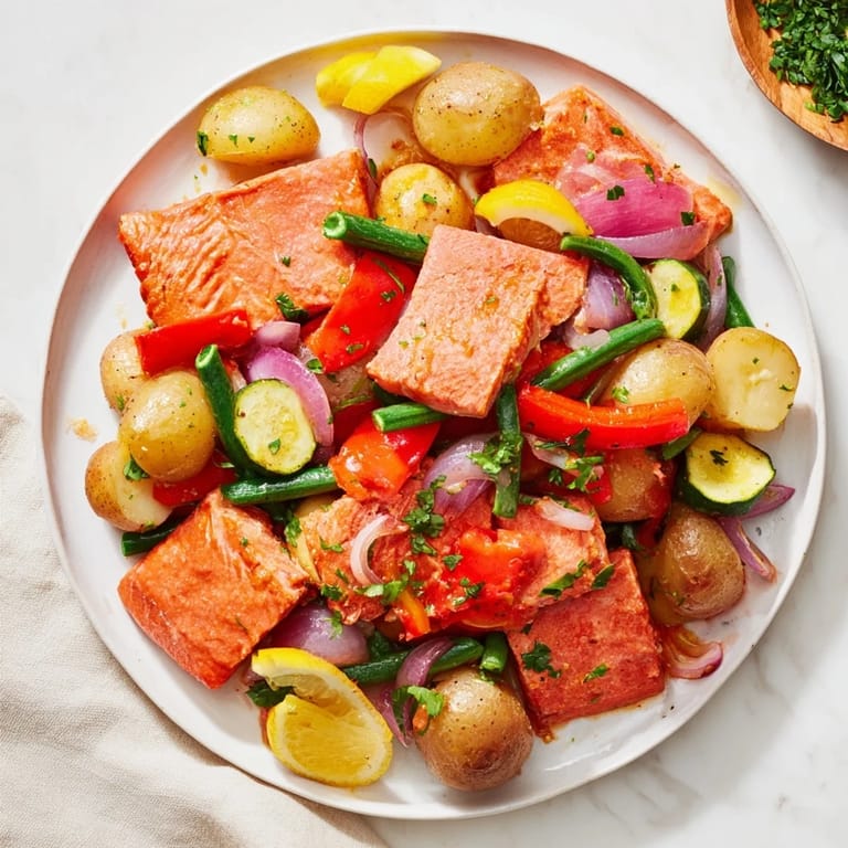 This dish combines tender salmon pieces with golden baby potatoes and a medley of fresh vegetables, all cooked in a single skillet. The flavors develop through a fragrant mix of garlic, smoked paprika, and thyme, finished with a squeeze of lemon and fresh parsley. It's a quick, easy meal ideal for two, bringing together vibrant colors and textures that offer a balanced, satisfying plate perfect for pescatarian diners.